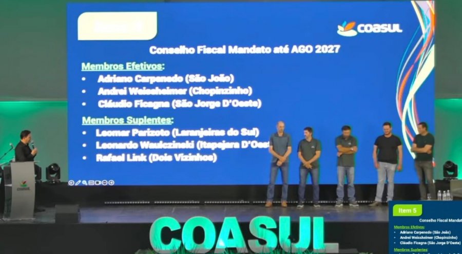 Durante a Assembleia Geral Ordinária (AGO) realizada na sexta-feira, dia 30, em Chopinzinho, foi eleito o novo Conselho Fiscal da Coasul – Cooperativa Agroindustrial, que terá mandato até a AGO de 2027.
